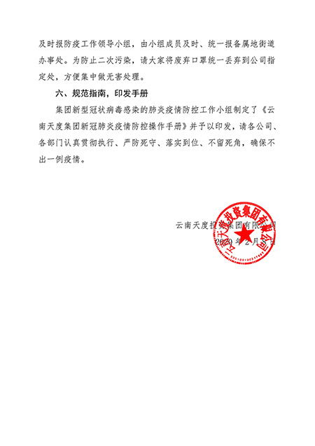 集团新型冠状病毒感染的肺炎疫情防控工作小组制定了《尊龙凯时新冠肺炎疫情防控操作手册》并予以印发,请各公司、各部门认真贯彻执行、严防死守、落实到位、不留死角,确保不出一例疫情。